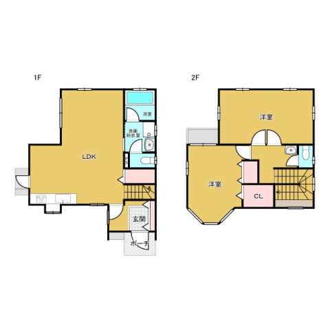 開放感のあるLDK9.5帖が広がる1階は、くつろぎやすく使い勝手の良い空間。2階には2部屋の洋室があり、寝室や趣味部屋として自在に使えます。ウォークインクローゼットや洗面室など、収納・水回りも効率的に配置されており、日々の生活が快適に。1人から2人暮らしに最適で、夫婦や少人数のご家族にぴったりの住まいです。